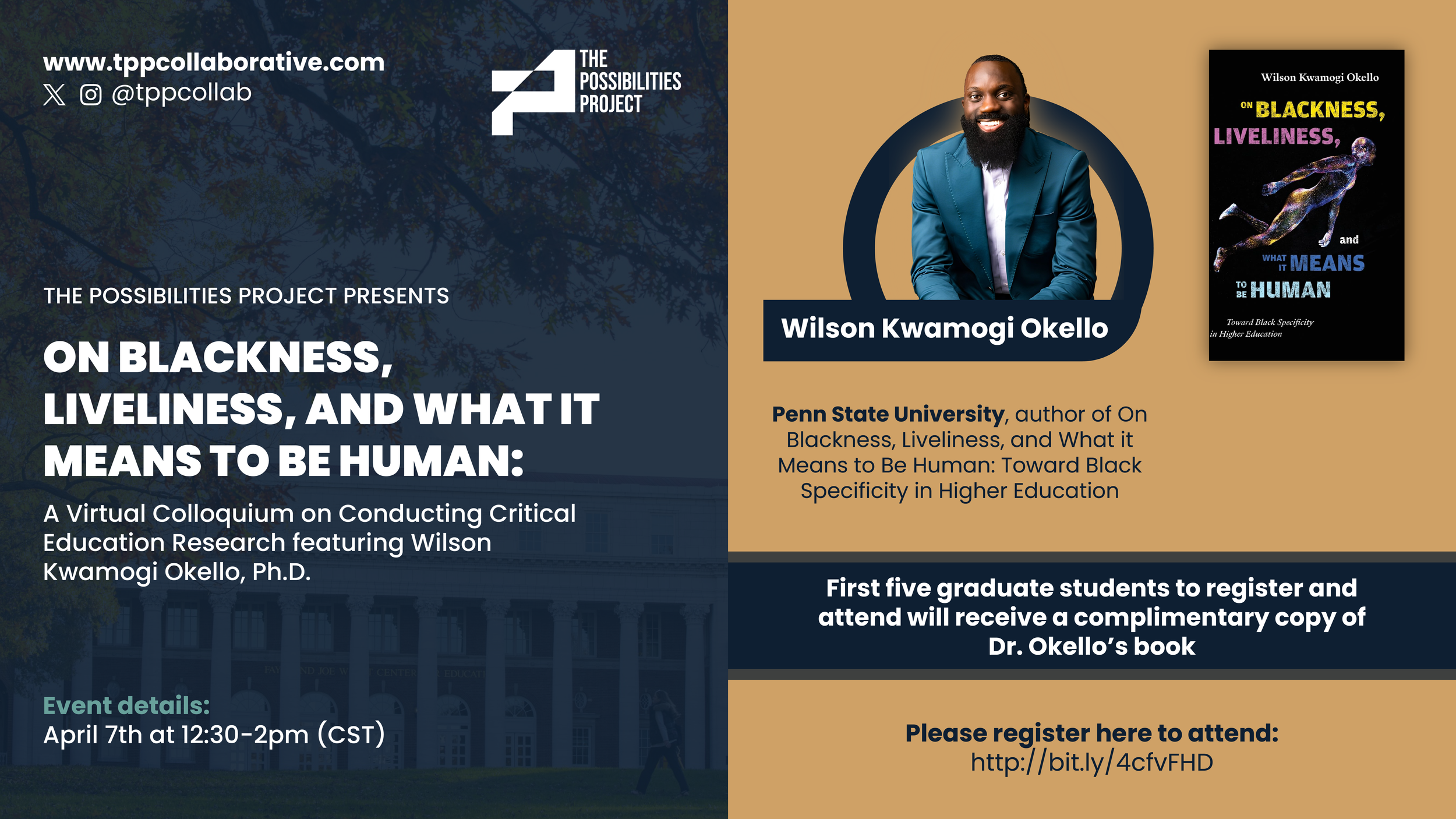 We were honored to host Dr. Wilson Kwamogi Okello on April 7th, 2025 to discuss ideas from his latest book On Blackness, Liveliness, and What It Means to Be Human. Dr. Okello is a “transdisciplinary artist and scholar” whose scholarship engages deeply with Black critical theories. We were honored to host Dr. Okello and glean inspiration from his engagement with attendees. He gave a brilliantly artistic opening talk followed by discussant remarks by Dr. Warren and a lively Q&A with the audience. Graduate students were gifted free copies of Dr. Wilson’s book. Learn more about Dr. Okello and his research lab by clicking on his image below.